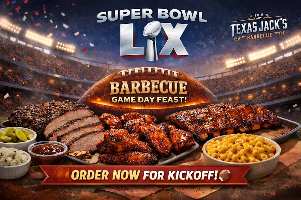 Make your Super Bowl LX even better with Texas Jack’s Barbecue—smoked brisket, tender ribs, wings, brisket eggrolls, plus chips & guacamole and smoked salsa for the perfect game-day spread. Pre-orders are available now, and regular takeout opens Sunday, February 8th. Order early and be game-day ready.